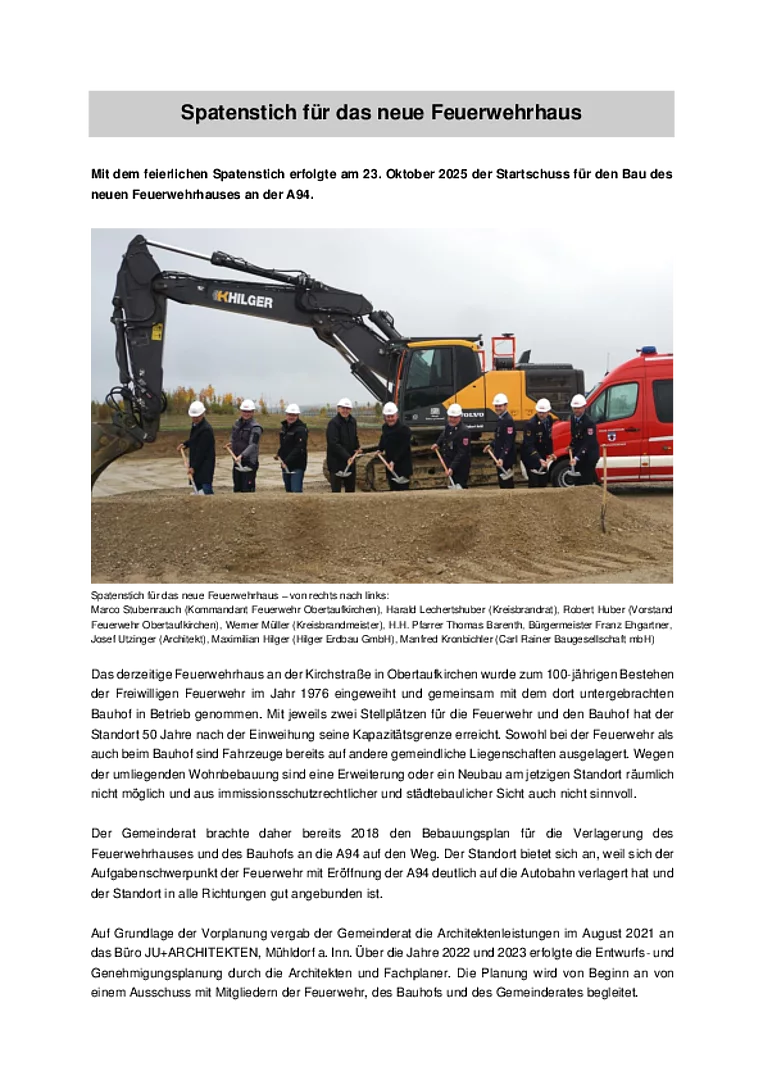 Mit dem feierlichen Spatenstich erfolgte am 23. Oktober 2025 der Startschuss für den Bau des neuen Feuerwehrhauses an der A94.